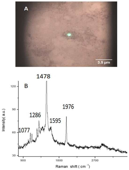 The formation of some “hot spots” is observed, usually in the “dark” regions of this sample. Hot spots are highly concentrated areas of strong local field enhancement attributed to localized surface plasmon resonance (LSPR) []. These regions, found in the gaps of metallic nanostructures, are known to significantly amplify SERS signals []. An example of this phenomenon can be observed in Figure 2B. The D and G bands of GO are visible at about 1365 cm−1 and 1595 cm−1, correspondingly. Moreover, it is possible to see the second order D + G band (≈2912 cm−1). In addition, several sharp peaks appear at about 1077 cm−1, 1122 cm−1, 1240 cm−1, 1286 cm−1, 1478 cm−1 and 1976 cm−1. All these distinct peaks are associated with localized vibrations of molecular groups bound to the GO network and in proximity to metal particles or nanostructures. These “hot spots” arise from the intense plasmonic coupling between the metal and the molecule, leading to an important enhancement of the Raman signal through the SERS effect. In particular, the peak at about 1478 cm−1 can be due to a CH2 deformation vibration; indeed, Aunkor et al. [] reported that the spectra of RGO display peaks that can be attributed to the CH2 stretching vibration. This observation might confirm that the atomic frame of sp2 carbon has arisen in RGO, thus indicating the transition from sp3 (oxidized regions) to sp2 (graphitic regions) hybridization [].
