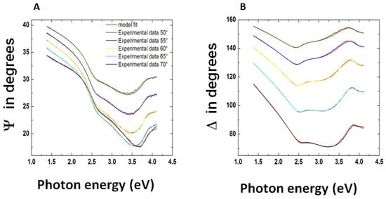In Figure 6A,B, the generated and experimental data of the ψ and Δ spectra are reported for different angles of incidents in the [1.3–4.1] eV photon energy range for the glass/Ag/GO/Au structure.