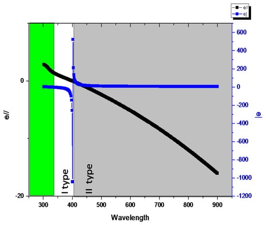 As illustrated in Figure 8, the medium exhibits dielectric behavior up to a wavelength of 323 nm (green area), as both and are positive. Between 323 nm and 400 nm (white area), > 0 while < 0, resulting in the emergence of a type I HMM region. At λ = 400 nm, the (Epsilon Near Zero and Pole) behavior obviously manifests a strong discontinuity in , passing from a very high negative value (virtually − ∞) to a very high positive one (virtually + ∞) while simultaneously, = 0. The HMM transitions to type II behavior at λ > 400 nm (grey area).