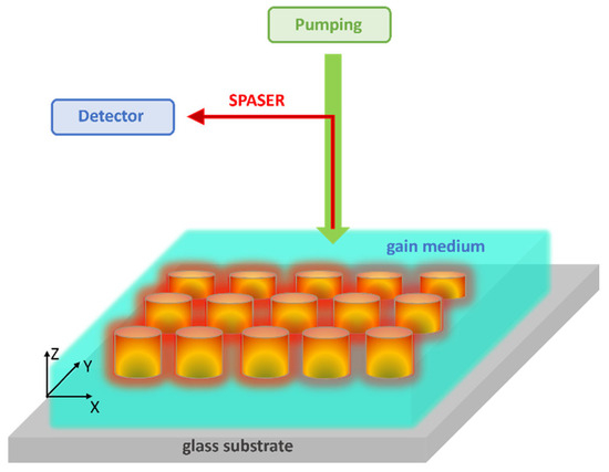 In recent years, the manipulation of light at the nanoscale has emerged as a promising research area, holding promise for diverse applications in fields such as sensing [1,2,3], imaging [4], and optical communication. An interesting aspect of their exploration revolves around examining the near-field enhancement within nanostructures, with a particular focus on the domain of nano-lasers, known as SPASERs—surface plasmon amplification by stimulated emission of radiation. These unique nano-lasers harness surface plasmon resonances in metal nanostructures to amplify coherent light emission, transcending the boundaries of traditional macroscale lasers [5]. Operating at nanoscale dimensions, SPASERs offer distinct advantages, notably their compatibility with other nanodevices and structures [6,7,8,9,10,11,12,13,14], presenting novel avenues for technological integration.