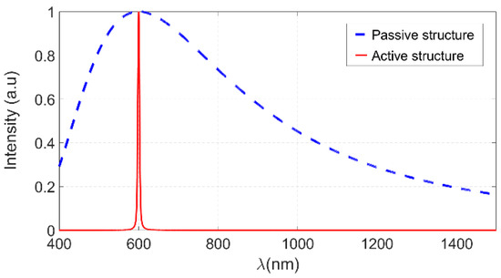 In Figure 2, we show the spectrum of the incident source for the active structure (a pic located at nm (red solid line)). For the passive structure without the gain medium, the incident field is rather very broad as presented in blue dashed line in Figure 2.