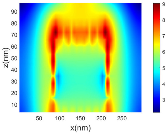 In Figure 4, we illustrate a cross section of the nanocylinder in the (z, x) plane. The field enhancement is plotted on a logarithmic scale, revealing significant enhancement in the proximity of the nanoparticle. The cross section was taken at the midpoint of the nanocylinder.