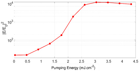 Here, E represents the field in the immediate vicinity of the nanoparticles, and signifies the incident electric field. It is essential to underscore that these two fields are evaluated at identical wavelengths—typically the resonance wavelength. However, the scenario changes significantly in the context of an active structure. As we explained earlier and as corroborated by Stockman’s theoretical framework [5], the excitation of plasmons occurs through a non-radiative energy transfer from the gain medium. This gain medium necessitates stimulation via monochromatic photons, in stark contrast to the wide-spectrum white-light excitation employed in passive structures.
