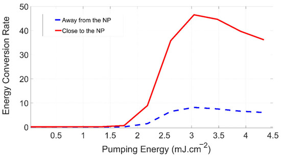 Figure 6 supports this perspective by visualizing the conversion rate’s dependence on the pumping energy, near and far away from the NP. Close to the NP, the red solid line, corresponding to a location next to the nanoparticle (z = 0 nm), clearly illustrates a markedly elevated energy conversion compared to the region distanced from the NP (represented by the blue dashed line, corresponding to a location 40 nm away from the nanoparticle along the z-axis).