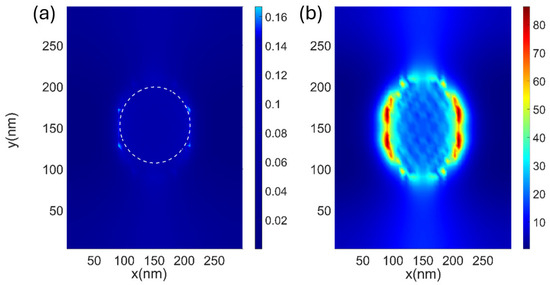 Figure 3 displays the spectra of the enhancement of the near field at nm, which is very close to the resonance wavelength in the far field nm, as it is well known that the resonance in the far field is slightly shifted compared to the near field [29].