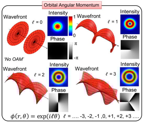 Schematic of OAM beams with different topological charge values. They exhibit different wavefronts, intensity distributions, and phase profiles. Reprinted from [2]. Creative Commons Attribution (CC BY) license.