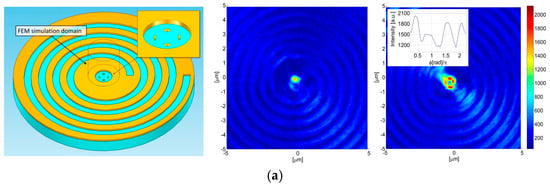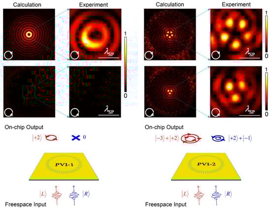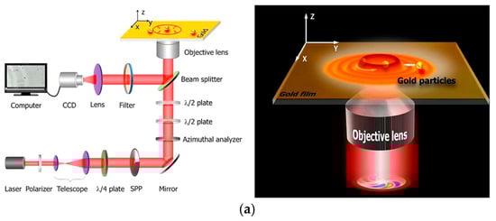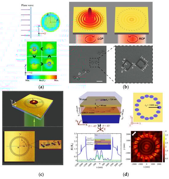 Numerous studies have demonstrated that plasmonic metasurfaces can manipulate the polarization of incident light through SPPs. OVs can even be generated using specifically designed plasmonic structures by specific incident polarization [70]. In recent years, researchers have shown that a spiral plasmonic lens can focus an appropriate circularly polarized light into a PV. Moreover, left- and right-handed circularly polarized light is focused into spatially separated plasmonic fields by such a lens (Figure 9). Zhan et al. utilized this property to create an efficient miniature circular polarization analyzer [71,72]. Zhang et al. proposed a more complex coaxial AS structure, and their simulation results indicated an improved coupling efficiency as a circular polarization analyzer [73]. Additionally, Afshinmanesh et al. integrated linear and spiral slits to measure the polarization state with the complete Stokes parameters [74,75].
