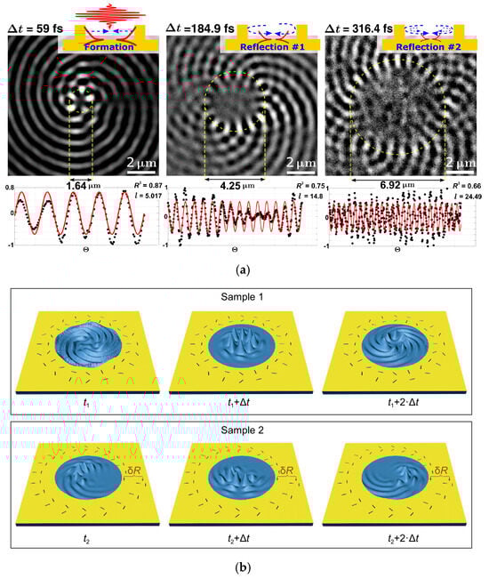 It is widely assumed that static boundary conditions and specific excitations determine the generated field. However, the initially generated PV evolves over time due to various factors, such as the propagation and reflection of the SPPs and spin–orbit coupling between light and the SPPs. Consequently, the spatiotemporal dynamics of PVs, alongside their average field distribution, are crucial for understanding the mechanism underlying these physical processes and expanding their range of applications. Here, we highlight some important studies that offer insight into these dynamics. Yang et al. counterintuitively identified the surprising existence of multiple deuterogenic PVs in a single plasmonic vortex lens (PVL), even when excited by a fixed, circularly polarized vortex beam, providing a glimpse into the dynamics of PVs [47]. Spector et al. explained that the reflection of the SPP vortex from structural boundaries generates successive vortex pulses with increasing topological charges as a function of time (Figure 5a) [48]. Subsequently, Yuan et al. demonstrated that PVs can have distinct spatiotemporal dynamics based on different coupler designs, even when the vortices possess the same topological charge (Figure 5b) [49]. Furthermore, Yuan et al. verified the existence of a temporally deuterogenic vortex mode whose spatiotemporal evolution could be tailored through various PVL designs and incident beams, enriching our understanding of PV dynamics [50]. Li et al. explored the effects of spin−orbit coupling on the spatiotemporal modulation of ultrafast PVs, including the formation of multiple phase singularities, energy flow loops, and changes in the localized OAM/SAM distribution [51].
