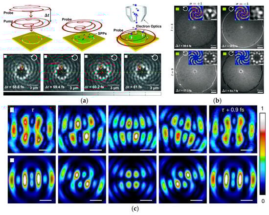 Next, we reviewed work on the detection of the dynamics of PVs, which helped to unveil the nature of plasmonic angular momentum and expanded the possibilities for new applications. Spektor et al. observed the detailed spatiotemporal evolution of nanovortices using time-resolved, two-photon photoemission electron microscopy (TR-2P–PEEM) and extracted the OAM magnitude of light based on the angular velocity of the vortex (Figure 7a) [60]. Additionally, Spektor et al. successfully achieved optical spin–orbit mixing through the interaction between three-dimensional (3D) light and two-dimensional (2D) PVs, with its mixing outcome transferred to matter via the excitation of electrons through a two-photon absorption process. The electrons were collected to provide a high-resolution map of the interaction (Figure 7b) [61].