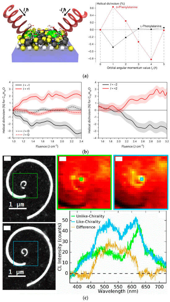 Since the discovery of OVs, many efforts have been made to utilize twisted light to discriminate chiral molecules, as the OAM in an OV can take unlimited values compared to the SAM, which has only two defined values. Currently, circular dichroism using circularly polarized excitation and the optical rotation of linearly polarized light are primary methods for characterizing chirality. Although some studies have shown that twisted light does not achieve chiral differentiation through electric or magnetic dipole interactions [67], recent experiments have demonstrated that linearly polarized twisted waves can exhibit helical dichroism when interacting with chiral samples via higher-order interactions, such as electric quadrupole interactions (Figure 8a,b) [67,68].