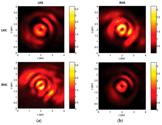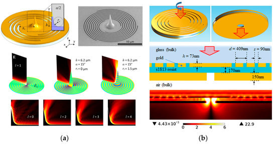 It is intuitive to see that the chirality of incident light is preserved in the evanescent Bessel beam through the symmetrical structure [28]. Shutova et al. proposed that a nanolens could efficiently focus OVs to the nanoscale and generate PVs (Figure 2) [35]. Meanwhile, Sunaba et al. demonstrated that a tailored plasmonic multimer could confine the Laguerre–Gaussian (LG) mode field into a nano-sized gap by transferring high-order OAM and spin angular momentum (SAM) from photons to localized plasmons [36].
