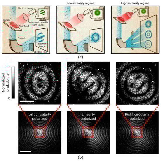 Moreover, these studies have broadened the scope of this field by inducing spatial electron modulation based on ultrafast interactions between electron pulses and plasmonic fields [92,93]. Vanacore et al. demonstrated this by using a femtosecond chiral plasmonic field generated by illuminating a circularly polarized pulsed laser onto a nanofabricated hole in a silver film on a Si3N4 membrane. This setup enables the interaction of both light and SPP fields with electron wavepackets as they pass through the hole, creating and controlling an ultrafast electron vortex beam [92]. Tsesses et al. dynamically controlled the electron beam by shaping the SPP patterns through various plasmonic coupling slits and by adjusting the SPP boundary conditions with different laser polarizations (Figure 14). Furthermore, by tuning the incident laser intensity and pulse width, and by post-selecting specific electron energies after an interaction with guided SPPs, they could unlock another type of electron spatial modulation [93].