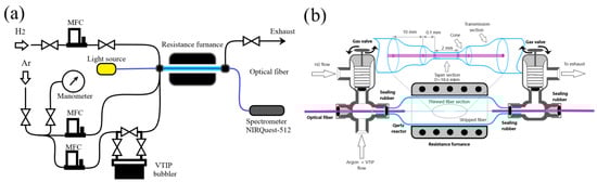 Scheme of vanadium oxide coating deposition by MOCVD and in situ control of optical path transmission spectrum (a). Enlarged part of quartz reactor with thinned segment of optical fiber placed (b). The inset shows an approximate image of thinned segment of optical fiber.