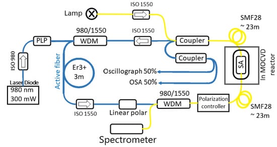 All fiber components and connectors in the ring were made using SMF-28e single-mode fiber. A 980 nm wavelength single-mode pigtailed laser diode of up to 300 mW output power was used as a pump source in the experiments. Silica fiber of our own production with an aluminosilicate core activated by erbium ions was used as the active medium. The absorption at 980 nm wavelength was 9.2 dB/m, and the total length was 3 m. The length was chosen to provide peak laser generation in the region of 1550–1560 nm. In this case, the MOCVD setup was located in a clean room, and the measurement stand was outside it in another room. Fiber components were also not shortened to facilitate manipulations with the circuit in different experiments. Based on this, the length of the ring resonator without an SA was measured accurately and was equal to 18.6 m. The total length together with the delivery fiber paths was about 66 m. Unfortunately, the conditions of use of the setup do not allow us to significantly reduce this length. The value of group velocity dispersion was equal to the standard value characteristic of SMF28e. Polarization-independent isolators (ISO 1550) provided the direction of radiation along the resonator. An isolator (ISO 980) and pump laser protector (PLP) were used to protect the pump laser diode. Both of these components prevent reflected power from reaching the pump diode. The radiation output from the ring was provided by an optical output coupler with a 70 × 30 ratio. An additional 50 × 50 ratio coupler was welded to the larger arm of this output coupler for simultaneous monitoring of the pulse shape and the generation spectrum. The spectrum and average power of laser radiation were recorded with a Keysight Agilent 86140B (Keysight Technologies, Inc., Santa Rosa, CA, USA) spectrum analyzer, and the shape, amplitude, and pulse repetition rate with a Picometrix-AP-300 (Picometrix LLC, Ann Arbor, MI, USA) photodetector connected to a Keysight MSOX3102T (Keysight Technologies, Inc., Santa Rosa, CA, USA) oscilloscope. The upper recording frequencies for these devices are 1.5 and 1 GHz, respectively. To control the transmission of the thinned light guide during the deposition process, an additional WDM and an isolator were introduced into the ring, preventing part of the laser radiation from entering the spectrometer.