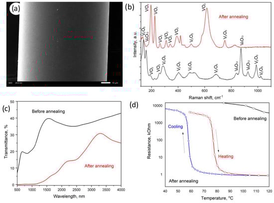 Characterization of the coatings obtained by the MOCVD method. SEM image of the surface of the optical fiber (a), Raman spectrum of 150 nm thick coatings on the sapphire surface before and after annealing in hydrogen (b), transmission spectra before and after annealing of the vanadium oxide coating on a quartz plate (c), data on the electrical resistance of the nanocoating on a thinned segment of the fiber at different temperatures (d).