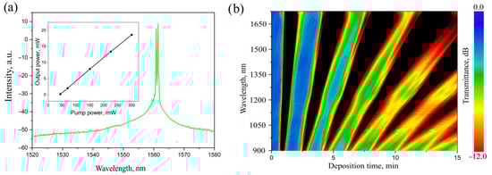 Investigation of optical parameters of a ring laser circuit with a Q-switch inside a quartz reactor. The laser generation spectrum obtained at a pump power of 150 mW is shown in (a). The inset shows the dependence of the output optical power on the pump power. A spectral scan of the deposition process is shown in (b). For clarity, the full transmission spectrum in the range from 900 to 1700 nm is shown.