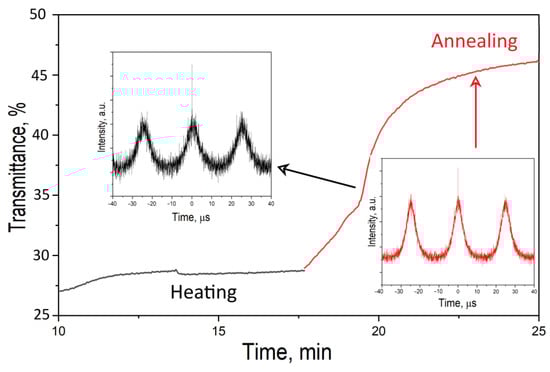To check the occurrence of a pulsed mode during the production of VO2, the optical characteristics of the laser were studied as the resulting coating was annealed. The annealing results are shown in Figure 5.