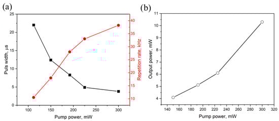 In continuous mode, the wavelength of laser generation is 1562 nm and the maximum output power is 17 mW (Figure 4a). The wavelength corresponds to the fact that the energy conversion in the active fiber occurs quite efficiently, since for erbium fiber, the better the fiber is pumped, the more long-wavelength the generation shifts. The low value of the output power is due to the use of a set of elements in the laboratory circuit that introduce additional losses but allow the circuit to be easily adapted to different generation modes. Such elements primarily include isolators and a pump laser protector that prevent reflected power from entering the pump diode.