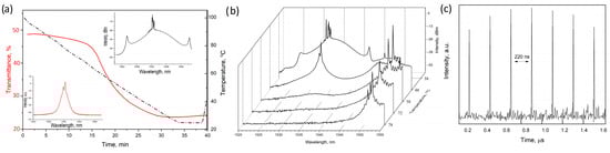 The transmission drop during modulator cooling was 24% in the predominant range of the observed spectrum and at a wavelength of 1350 nm. As cooling proceeds, an increase in losses in the resonator is observed, accompanied by a drop in transmission (Figure 7). An increase in resonator losses is accompanied by a shift of the generation peak to a shorter-wavelength region of the spectrum. At the moment of time corresponding to a temperature of about 50 °C, two peaks at about 1550 and 1530 nm appear simultaneously. Due to the high gain of the erbium active fiber in the region closer to 1530 nm, the incompletely “pumped” active medium allows maintaining generation only at this wavelength. At the moment of phase reconstruction of the saturable absorber material, a short-term mode-locking occurs. This change in the pulse regime is accompanied by a characteristic broadening of the generation spectrum and a sharp change in the pulse shape. In this case, the nature of the pulses shown in Figure 7c shows that the pulse repetition rate is the same, unlike the amplitude. Such an effect can be observed due to the residual influence of the Q-switch mode. The non-uniformity of the material on the cones of the thinned fiber segment contributes to the overall behavior of the pulsed mode, and by adjusting the geometry of the thinned section, it is possible to achieve a more stable mode. In addition, the output optical coupler is selected in such a way as to provide the best laser generation characteristics in the Q-switch and is not optimal in the mode-locking. A further increase in losses in the resonator leads to the disappearance of the pulsed generation and a transition to a continuous wave. The pulse duration in the mode-locking was 3.2 ns at a frequency of 4.5 MHz.