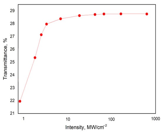 The absorption saturation effect parameters for the used vanadium dioxide were estimated using plane-parallel plates with a 300 nm thick coating. A standard Z-scan system with an open aperture was used for this purpose. A PERl-OEM femtosecond laser (Avesta-Project Ltd., Moscow, Russia) with a pulse duration of 80 fs and an output power of 200 mW was used as a radiation source. Two PD300R-IR units from (Ophir Optronics Solutions Ltd., Jerusalem, Israel) and a set of attenuators and filters were used as power meters. An electric translator was used to change the plate coordinate. The result of measuring the transmittance dependence of the plate with the material is shown in Figure 8.