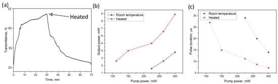 In contrast to the film implementation of the Q-switch, the transmission jump at a wavelength of 1350 nm was 28%, but was accompanied by some small oscillations arising due to the movement of the softening polymer mass. At the same time, in contrast to the clearly expressed phase transition, accompanied by a significant change in the optical characteristics of lasing, in this case, there is only an increase in losses due to a change in the refractive index of the polymer composite. An increase in the refractive index of PDMSe due to heating leads to a more efficient output of the optical field from the fiber and leads to an increase in losses. Because of this, the Q-switch mode characteristics do not change, but only the threshold of its formation shifts (Figure 9b,c). The maximum average power of lasing obtained in the ring with a heated SA was 8.8 mW. The pulse repetition rate and their duration in the Q-switch mode were 27 kHz and 7.2 μs, respectively. Using a polymer as a matrix for a saturable absorber is not effective since it allows achieving rather weak pulse mode parameters in comparison with a film implementation. In addition, the property of a polymer composite changing its optical characteristics depending on temperature does not allow a reliable assessment of the contribution of the SA material.