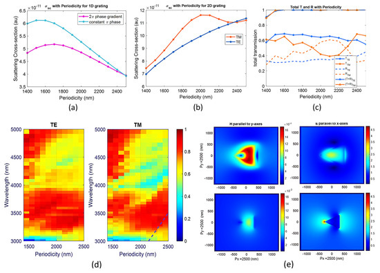 From the linear polarization (LP) separation design, we can see from Figure 2d that the transmission efficiency is highest around the periodicity Px = Py = 1600 nm, for both prominent transmission orders at the two LP separation order positions, D1 and D2. Here, by Px = Py, we mean the periodicity of the single-element unit cell. So, for the normalized lattice constant Px/λ0 = Py/λ0 = 0.625 to 0.35 ratios, the best transmission comes when Px = Py = 0.4 λ0. However, we can say that the propagation phase correlation between the meta-elements in this range remains intact. Although the generalized Snell law explains the phase gradient metasurface, which has served its purpose for decades, its effect on the scattering cross-section is not discussed much. As shown in Figure 3, we investigate the scattering cross-section for the phase gradient metasurface grating (PGMG) for both TE and TM incidence, and we compare the total transmission efficiency for the 2D metasurface.