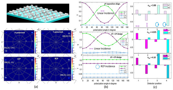 To incorporate LP and CP detection from the same metasurface to the different pixel positions of the detector, we finally came to a design as shown in Figure 4a. The LP detector positions are D1(ɵ,ϕ) = (26°, −145°) and D2(ɵ,ϕ) = (26°, 35°), and the CP detector positions are D3(ɵ,ϕ) = (26°, −35°) and D4(ɵ,ϕ) = (26°, 145°), as we can see in the far-field projection in Figure 4a. So, the final design can measure arbitrary LP and CP states simultaneously. The calculated Stokes parameter is shown in Figure 4a,c, and it is derived by using the following Stokes parameter calculation. The Jones vector representation of the E-field components is as follows [40,46]: