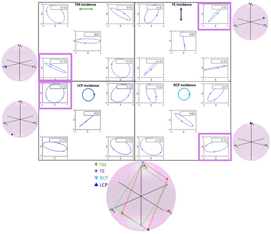 Simultaneous polarization ellipse at the four designated polarization order positions for a particular incidence polarization. Prominent order for TM at (−1, −1), TE at (1, 1), RCP at (1, −1), LCP at (−1, 1) position, and all (0, 0) order position. Outside the Poincaré spheres are the reconstructed Stokes vectors for those prominent orders outlined with pink. The bottom Poincaré sphere is the metasurface-analyzed Stokes vector from all the order positions. The green square represents the maximally different polarization states, and the dotted red line shows the polarimetric reconstruction of the metasurface analyzer’s polarization states based on the simulated intensity.