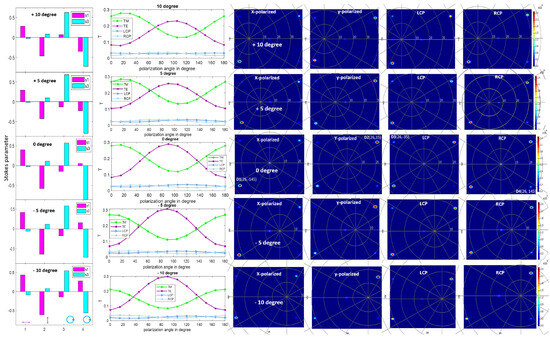Stokes parameter (left), transmission (middle), and far-field angular projection (right) from 10° (top) to −10° (bottom) tilted incident polarization with 0–180° polarization rotation. The designated polarization states used for the detection are indicated underneath as the detector number for the left picture.