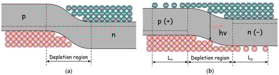 The simplest realisation of an LED is a device based on a p-n homojunction, i.e., a junction formed by contact between two semiconductors made of the same material but with different types of conductivity (opposite types of doping). A schematic representation of the operation mechanism of an LED based on a p-n junction (p-n-LED) is shown in Figure 2. At the boundary of the p-n junction, charge diffusion occurs to align the Fermi levels of semiconductors, which leads to the formation of a depletion region. When forward bias is applied (positive contact with the p-semiconductor and negative contact with the n-semiconductor), the magnitude of the p-n junction barrier will decrease, resulting in increased diffusion of charge carriers across the barrier. Through radiative recombination, photon emission will mainly occur in the depletion region because it has the highest concentration of electron–hole pairs. However, it is worth noting that recombination will not be confined to the depletion region but will occur along the entire electron and hole diffusion lengths, Ln and Lp, respectively. Usually, in semiconductors, the diffusion length is on the order of a few micrometres. The emission intensity of the forward-biased silicon-based p-n junction is very small due to the low probability of radiative recombination (≈10−14 cm3·s−1) [36].