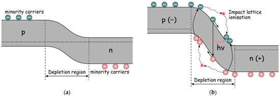 Mechanism of avalanche LED operation without (a) and with (b) bias (adapted from [37]).