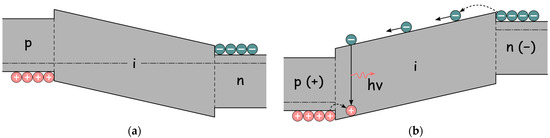 In photodiode technology, the addition of an intrinsic intermediate layer (i-layer) of the same material as the p- and n-layers will increase the size of the depletion region. This technological approach is used to increase the performance of photodiodes. However, in LEDs, the use of an i-layer is only justified for controlling the spectral properties of the emitted light. For example, amorphous semiconductors, in particular silicon carbide (α-SiC), are characterised by a change in the bandgap when they are doped [41]. Thus, by controlling the optical gap of the i-layer of α-SiC, it is possible to configure the properties of electroluminescence emission [42,43]. Due to the difference in the bandgaps of p-, i- and n-layers, barriers are formed at the p-i and i-n boundaries. Since the height of these barriers is great enough (≈0.2–0.4 eV), thermal injection of carriers from the p and n layers into the i-layer does not occur. A p-i-n-LED (LED based on p-i-n structure, Figure 4) operates in the direct bias mode. By means of a strong external electric field, there is a tunnelling injection of carriers through these barriers. In addition, the injection of electrons is faster than the injection of holes, so that the electronic current through the i-n barrier increases sharply, causing most of the electron–hole pairs to radiatively recombine closer to the p-i interface. The electroluminescent properties of p-i-n-LEDs will mainly depend on the barrier height, especially at the p-i interface.