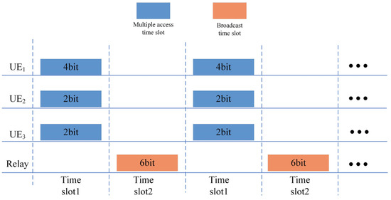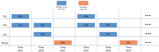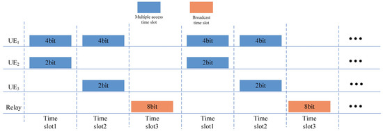 Because of the unique nature of the signals received in time slot 1 and time slot 2, PABS-PNC can facilitate the information exchange among three users using three time slots. In time slot 1, and transmit optical signals to the relay node. In time slot 2, and transmit optical signals to the relay node. PD receives the combined signal from () and in time slot 1 (time slot 2). This characteristic leads to a new multiple-access strategy, as shown in Figure 6.