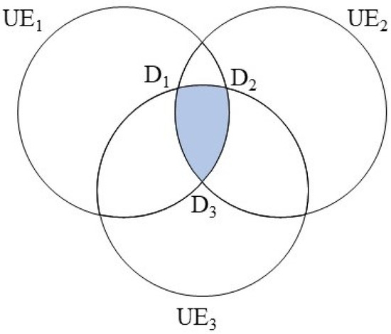 Therefore, the relay node can receive optical signals throughout the region , denotes the concatenation of regions. However, not all places within the concatenated region can realize PNC communication. The region in which the relay node is located must be able to receive optical signals from all three users otherwise Equation (16) is meaningless. That is, the value of , , cannot be 0. Then, there are: