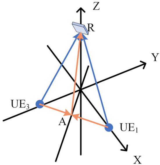 Using the property of the perpendicular bisector, it can be deduced that for the first equation in Equation (29) to hold, the relay node should be positioned meters above the perpendicular bisector of the line connecting the two user nodes. For the second equation in Equation (29) to hold, the main optical axis of the PD should point towards the perpendicular bisector. Because the PABS-PNC method also requires receiving signals in time slot 2, the PD placement in the PABS-PNC method must consider the needs of both time slots. Therefore, in the PABS-PNC method, the PD should be positioned above the intersection of the two perpendicular bisectors, with its main optical axis pointing towards this intersection. When discussing a certain PD detector in the MRA-PABS-PNC method using Equations (25)–(29), the two users in the equations should be considered as the actual users involved in the optical signal superposition. For example, when discussing in the MRA-PABS-PNC method, the two users in Equations (25)–(29) should be regarded as and . In the MRA-PABS-PNC method, which has two PD detectors, it is not necessary for the optical axis to point toward the intersection. Each PD is used to receive the superimposed signals from different users. Instead, the main optical axis of the PD detector should point to the midpoint of the line between the two users (The midpoint is a point on the perpendicular bisector), as shown in Figure 9. Here, the polar angle of the angle between ’s main optical axis and the incident light is , which allows to be minimized while satisfying the second equation of Equation (29). Minimizing ensures that the effective area of the detector is maximized, allowing to take its maximum value, thereby maximizing the right-hand side of Equation (27). The polar angle of ’s main optical axis can be calculated using Equation (30), and the polar angle of ’s main optical axis can be calculated using Equation (31). In Equations (30) and (31), the part calculates the polar angle between the vector pointing from the PD detector to the midpoint of the user line and the negative direction of the z-axis. Finally, by subtracting this angle from , the polar angle between the vector and the positive direction of the z-axis is obtained. The closer the main optical axis of the PD detector is to this direction, the better the system will perform in terms of BER.