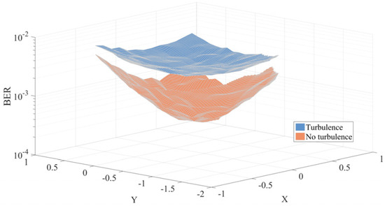 In this paper, the relay node is located 10 m above the xy plane. The Cartesian coordinates of each UE can be expressed as , , and . is the noise power, and its value can be determined from the noise power received by in the MRA-PABS-PNC method under conditions of no turbulence, SNR = 20.55 dB, with a polar angle of and a supporting angle of . This paper first uses the PABS-PNC method to find the optimal placement of the PD, with the noise power being set to . As shown in Figure 10, the system’s BER is lowest when the relay node is located above the intersection of the two perpendicular bisectors (at ), regardless of whether the environment is turbulent or not. It can also be seen that turbulence significantly degrades the system’s BER performance. When the relay node is located at , the system’s BER is under the non-turbulence channel. Under the turbulence channel, the BER increases to , representing a one-order-of-magnitude degradation in performance.