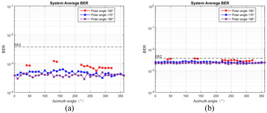 BER performance of PABS-PNC system with different polar and azimuth angles. (a) Non−turbulent channel. (b) Turbulent channel.