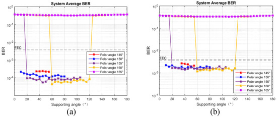 BER performance of MRA-PABS-PNC system with different polar and supporting angles. (a) Non-turbulent channel. (b) Turbulent channel.