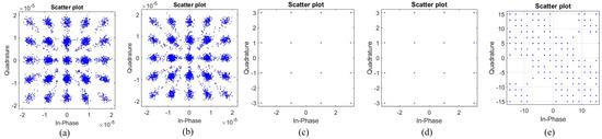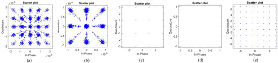 Relay node constellation diagram for each step using the MPBS-PNC method. (a) The constellation diagram received by the relay node at the first time slot, (b) the constellation diagram received at the second time slot, (c) the constellation diagram of (a) after higher−order PNC mapping, (d) the constellation diagram of (b) after higher−order PNC mapping, and (e) the constellation diagram of (a) sent by the relay node to the subscriber node after bit splicing.
