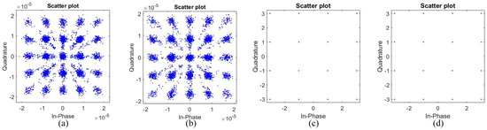 Relay node constellation diagram for each step using the FT-PNC method. (a) The constellation diagram received by the relay node in a first time slot, (b) the constellation diagram received in a second time slot, (c) the constellation diagram sent by the relay node to the user node in a third time slot after higher−order PNC mapping of (a), and (d) the constellation diagram sent by the relay node to the user node in a fourth time slot after higher−order PNC mapping of (b).