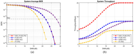 The BER performance and throughput performance comparison of MPBS-PNC, FT-PNC, PABS-PNC, and MRA-PABS-PNC methods. (a) BER performance comparison; (b) Throughput Performance Comparison.