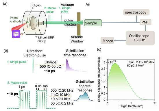 (a) The instrumental setup for in situ time and spectral measurements of β-Ga2O3 in DC-SRF-II gun beamline at Peking University. (b) The temporal profiles of the electron beam for scintillation time/spectral performance characterization of β-Ga2O3. (c) Simulated total energy deposition rate of 2 MeV pulsed electron beam with 50 pC charge.