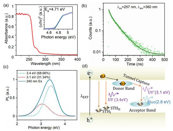 The optical absorption spectrum is shown in Figure 2a. The sharp absorption edge is around 250 nm. The inset shows the deduced Tauc plot of (αhv)2 as a function of photon energy, where α is the absorption coefficient and hv is the photon energy. Consequently, it can be observed that the optical bandgap of this β-Ga2O3 crystal is 4.71 eV, consistent with previous reported values [31,32]. Figure 2b shows the scintillation decay time excited by 257 nm pulsed laser using FLS1000. Fitted by the bi-exponential decay curve, the fast/slow component is 11.67 ns (38.9%)/58.72 ns (61.1%). The averaged decay time is 40.41 ns, consistent with previous studies [33,34,35]. Figure 2c shows the photoluminescence (PL) spectra. A broad spectrum from 2.5 eV to 4 eV is presented under the excitation of 240 nm. It can be decomposed into two Gaussian luminescence bands, 3.4 eV (68.66%) and 3.1 eV (31.34%). The luminescence processes are schematically illustrated in Figure 2d. The 3.4 eV (UV band) peak luminescence is independent of sample preparation methods or dopants [7]. It is attributed to an intrinsic luminescent process arising from the recombination of self-trapped holes and free electrons, with emission energies ranging from 3.2 to 3.7 eV. The 3.1 eV (UV’ band) peak is the result of the donor–acceptor luminescence [23,36].