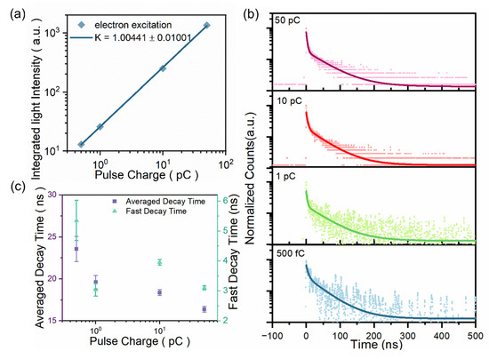 (a) A plot of log (integrated light intensity) vs. log (pulse charge). Solid lines are the linear fitting curves. (b) Time-resolved decay curves under pulsed electron bunch excitation of different charge levels. (c) The averaged decay time and the fast decay time components for different dose rates derived from different charges in the 10 ps electron bunch.