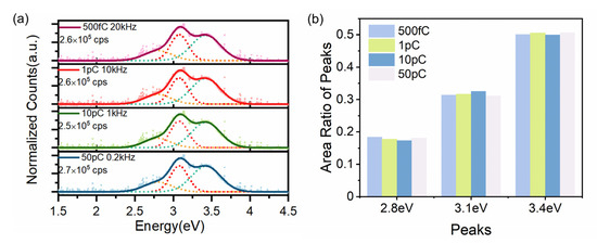In order to explore whether the luminescence spectra of β-Ga2O3 are stable under the excitation of high-charge electron irradiation, experiments were conducted by varying the electron charges in a macro pulse, as shown in Figure 5a. Remarkably, the shape of the spectrum exhibits negligible changes across 500 fC to 50 pC (approximately 107 Gy/s to 109 Gy/s for a single bunch), suggesting that the emission bands remain relatively unaltered. The relative contributions of each emission peak were quantified and presented in Figure 5b, where different groups correspond to specific excitation conditions. This indicates that the radiation damage has a negligible impact on the spectral results across varying excitation dose rates (different electron bunch charges), which further demonstrate the stability of β-Ga2O3 under high charge (500 fC to 50 pC) and high dose rate (107 Gy/s to 109 Gy/s) electron irradiation.