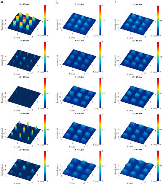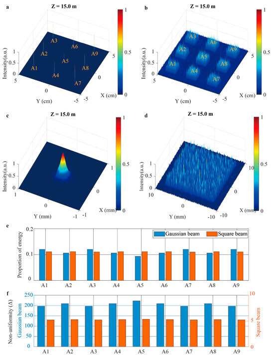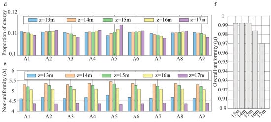 According to the simulation analysis results presented in Figure 3a–c, within the same propagation distance range of 13 to 17 m, traditional Gaussian beams exhibit a significant decrease in energy uniformity when the drone’s position shifts, as shown in Figure 3a. This is due to the inherent characteristics of Gaussian beams, where energy density is concentrated in the focal plane. As the propagation distance increases or the receiver position shifts, the working distance no longer aligns perfectly with the photovoltaic cell array, leading to reduced energy absorption efficiency. In contrast, the energy distribution of the nine square spots optimized by our MFSM system maintains high uniformity within the 13 to 17 m propagation range. As illustrated in Figure 3d,f, the overall energy uniformity of the spots exceeds 95%. This performance is attributed to the unique design of the metalens, which ensures good spot shape and uniform energy distribution over a wide distance range, even if there are slight positional changes in the drone, thereby not significantly impacting overall energy absorption efficiency. Figure 3e illustrates the variation in non-uniformity Δ for each spot at different transmission distances. The results show that the square spots generated by the metalens exhibit lower Δ, indicating that they can provide stable energy transmission over a broader charging range, which is highly advantageous for practical drone operations.