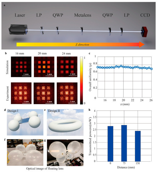 Experimental verification of the metalens and floating structure: (a) Schematic diagram of the experimental setup for metalens testing; (b) Comparison between experimental and simulation results of square beam spots at various propagation distances; (c) Experimental results of the overall uniformity (μ) of the beam spots at different propagation distances; (d,e) 3D models of the floating structure; (f,g) Experimental verification images of the balloon-supported floating structure; (h) Laser-transmitted power at different positions of the flexible lens.