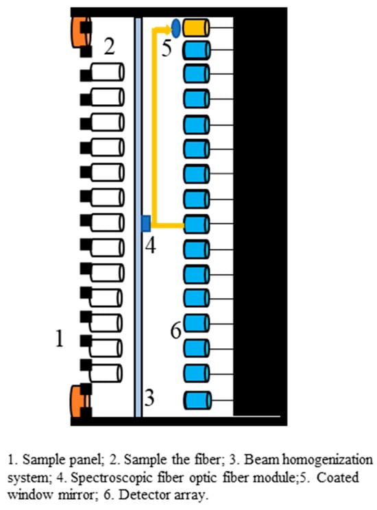 Upon the application of the aforementioned method within the detector array measurement system, it is observed that the quantity of detectors present on the target surface is notably large. Under long-distance transmission scenarios, the target size of the detector array typically exceeds 30 cm × 30 cm. Consequently, in an attempt to nullify the spectral response difference of the detectors by installing a coated window mirror at the front end of the detectors, either a considerably large window mirror is necessitated or a substantial number of small-sized lenses are required. This invariably leads to a significant escalation in both the development cost of the measurement system and the intricacy of its structural configuration. Hence, this research proposes a methodology to mitigate the quantum efficiency difference by exploiting the single channel of the detector. The schematic diagram illustrating the structure of eliminating the quantum efficiency difference within the detector array measurement system via a single channel and a coated window mirror is presented in Figure 5. Within the central region of the detector array measurement system, a single-channel detector is chosen, and a beam splitter fiber module is installed at the rear end of the attenuation homogenization system. In this manner, one laser beam is directed towards the detector at its original corresponding position, while the other laser beam is irradiated onto the coated window mirror and subsequently impinges upon the detector after traversing the window mirror.