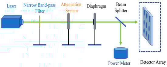 Within a specific wavelength range, the quantum efficiency of the detector spans from SR1 to SRn. Upon the installation of a coated window mirror at the front end of the detector, the quantum efficiency within this wavelength range alters to SRm. Given that the measurement system is required to quantitatively compute the laser power parameters based on the incident optical signal, calibration against a standard light source is imperative during the development of the measurement system. This facilitates the acquisition of the power conversion coefficient Kbd, which represents the relationship between the output current value of the measurement system and the incident laser power. A single-wavelength narrow-linewidth light source, characterized by a stable laser working mode and stable power, is selected for this calibration purpose. The output wavelength of the calibrated light source is denoted as λbd, its power as Pbd, and the quantum efficiency of the detector at this wavelength is recorded as QEbd. Subsequently, the laser power conversion coefficient of the channel devoid of the window mirror detector is computed as K00 = 1/SRbd, while that of the channel equipped with the coated window mirror is calculated as K01 = 1/SRm. Generally speaking, the wavelength range of the light source employed for calibration ought to align with that of the actual measured laser emission system. However, for certain specific wavelengths, a stable calibration light source is notably absent. Consequently, in the actual calibration process, single-wavelength calibration is typically adopted, and the calibration process after traversing a narrowband filter is illustrated in Figure 6; due to the attenuation system and diaphragm, the laser light impinges upon the beam splitter. Here, 50% of the laser is directed towards the detector array target, while the remaining 50% is incident upon the power meter. On the one hand, the power conversion coefficient of the detector can be derived from the measured value of the power meter and the output current value of the single channel of the detector array, namely the aforementioned Kbd. On the other hand, by stabilizing the illumination of the light source, the uniformity of all detector units on the target surface can be calibrated, thereby ensuring a consistent output response.