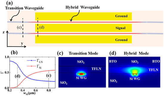 Figure 2a illustrates the coupling section from the transition waveguide to the hybrid waveguide. A gradual reduction in the width of the Si waveguides allows for the transition of the light from the Si waveguides to the LN layer. This transition is quantified by the fraction (ΓLN) of the integral over the cross-sectional profile of the Poynting power that resides in the LN region. Figure 2d depicts the correlation between wSi and the ΓLN and ΓSi parameters, with the calculations performed at an hSi value of 150 nm and an hcmp value of 20 nm. In the hybrid waveguide, we chose wSi = 320 nm after weighing up the options. Therefore, the majority of the light is confined within the TFLN, with only 6% of the Poynting vector located in the Si compared to 75% in the TFLN, and the remainder distributed in the cladding, as shown in Figure 2c. The high value of ΓLN is typically maintained at approximately 80% in the hybrid mode [13,14,15], and the wSi is not reduced any further, in order to have a laterally confined optical mode. In this case, there is no high optical loss from the metal electrodes, and the transition loss is kept low [13]. Furthermore, a high value of ΓLN and low optical loss may also be attained with different Si waveguide and hcmp sizes. A large amount of related research on Si-LN hybrid waveguides has already been published [13,14,15,25], and the parameters of the Si waveguide used in this paper are only a common example.
